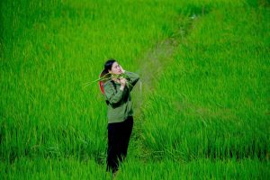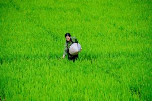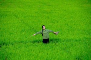 Trên con đường về An Eco Homestay, những cánh đồng lúa trải dài mơn mởn, xanh ngút ngàn như ôm lấy bước chân lữ khách.